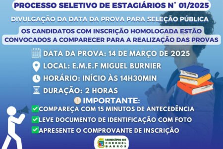 A Prefeitura de Coronel Barros divulga o deferimento das inscrições do PROCESSO SELETIVO DE ESTAGIÁRIOS N° 01/2025 e informa a data da prova!