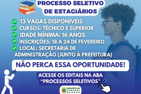 Prefeitura de Coronel Barros abre inscrições para Processo Seletivo de Estagiários